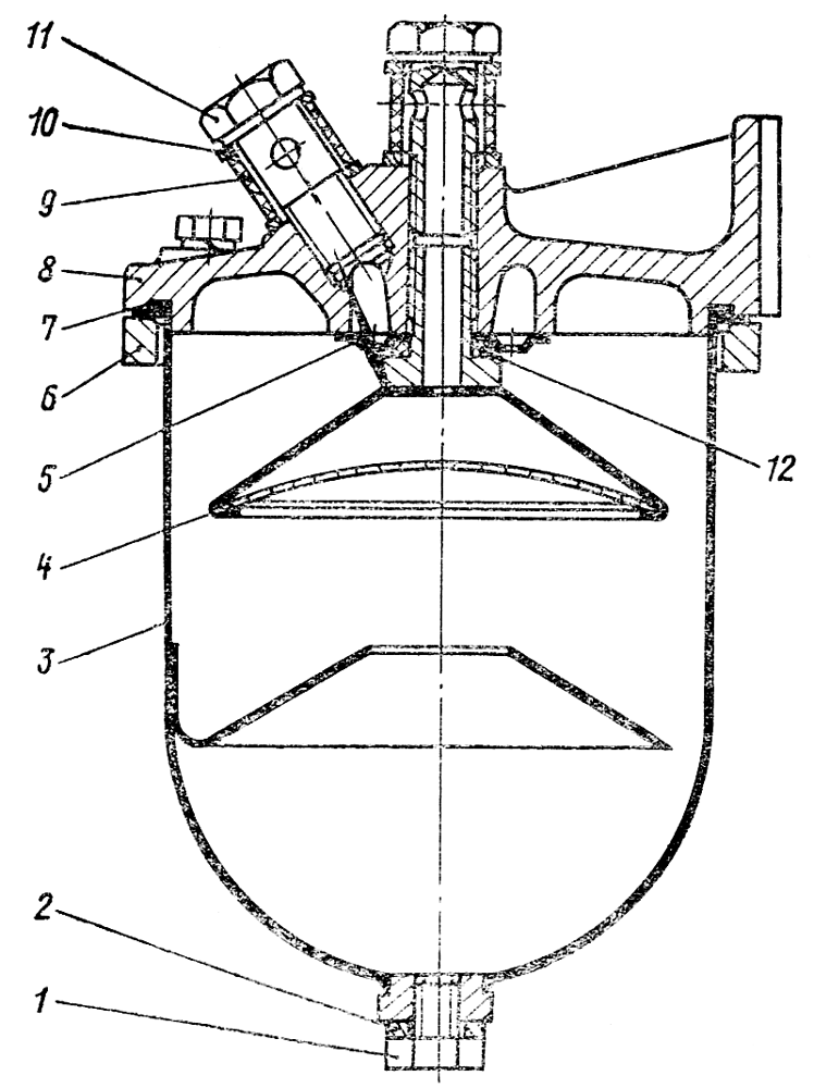 Установите в корпус фильтра 8 распределитель 5 и вверните в резьбовое отверстие отражатель 4 с пружинной шайбой 12. Момент затяжки отражателя 40 Н-м (4 кгс-м).