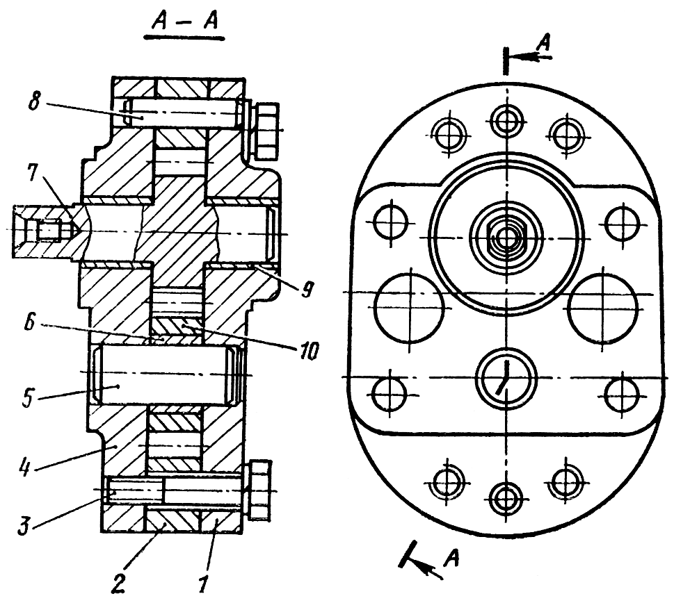 Расстопорите, выверните болт 9 из вала насоса и снимите шестерню 6 с вала 8. Снимите упорное кольцо 7. Выверните болты крепления корпуса 2 к насосу 4 и снимите корпус. Выверните четыре болта 3 ( рис. 216 ) крепления крышек насоса и разъедините крышки 1 и 4 с корпусом. Отметьте взаимное положение шестерни 10 и крышки 1 для того, чтобы при сборке установить в прежнее положение. Снимите шестерни. Выпрессуйте ось 5 ведомой шестерни из нижней крышки 1. Выпрессуйте, при необходимости, ступенчатой оправкой втулки 6 и 9.