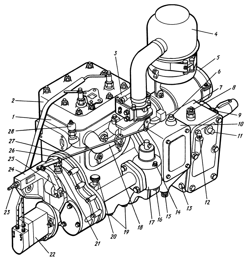 На валу редуктора смонтирован механизм включения, имеющий шестерню 15 со спиральными зубьями, вводимую рычагом при пуске ее в зацепление с венцом маховика дизеля. Через эту шестерню пусковой двигатель прокручивает коленчатый вал дизеля. Шестерню в зацеплении с венцом маховика удерживают две защелки 17, сжимаемые пружиной 19. Как только дизель заведется, защелки под действием центробежной силы расходятся, и шестерня механизма включения автоматически,выходит из зацепления с венцом маховика дизеля благодаря давлению зубьев венца маховика на спиральные зубья шестерни и пружины 16 через толкатель 21.